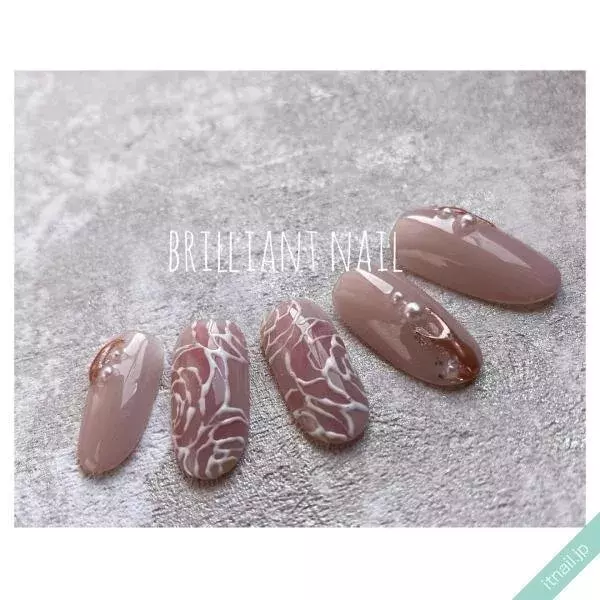 ヌーディーピンクベージュ 大人上品 ビジュー 先端ゴールド 大理石ネイル